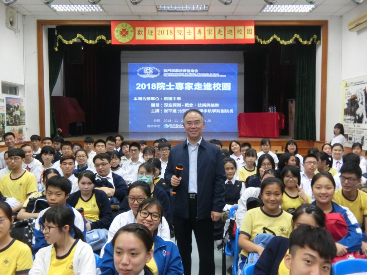 院士專家走進校園科普活動”為澳門科學技術協進會每年舉辦的特色科普活動。於2015年2月首次舉辦後,得到了學校及社會各界很大的迴響;活動多次組織外地專家們走進本澳校園,今年2018年10月31日起直至11月3日,4位航空專家分別是龍樂豪院士、劉永才院士、吳海濤院長、崔平遠院長,走進12間學校,與師生分享各自領域的科技發展前景,航天的發展歷史、相關的物理知識、中國目前航天發展的現狀等,分享自身科普經驗、知識及技術,激發學生對科技的興趣,積極推動創新教學,培育學生的創意思維,從而投身科技行業。