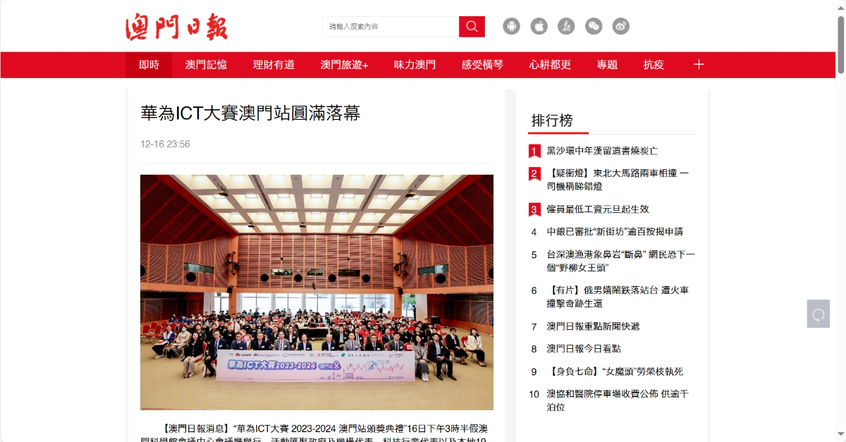 “華為ICT大賽 2023-2024 澳門站頒獎典禮”16日下午3時半假澳門科學館會議中心會議廳舉行。活動匯聚政府及機構代表、科技行業代表以及本地19間院校師生等200餘人參與,共同圍繞人才培育,提升本地科技人才競爭力等議題進行研討,幷表彰本届大賽優勝隊伍。
