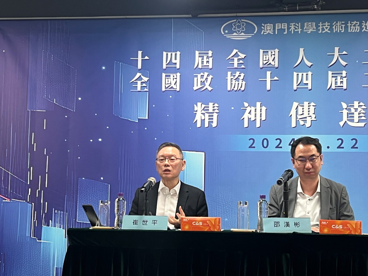 澳門科協於3月22日晚8時在萬基工業大廈六樓會議廳舉辦"2024澳門科技界兩會精神傳達會"。由澳區全國人大代表、澳門科協會長崔世平及全國政協澳區委員高錦輝分享。