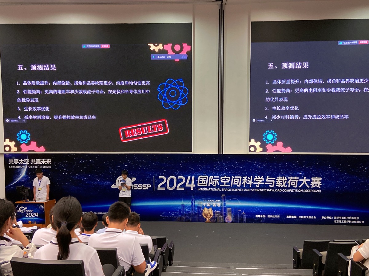 同善堂中學同善百年隊隊伍憑借其項目「空間站利用提拉法生成單晶硅的優化實驗方案」榮獲銅獎。隊伍代表吳同學表示“匯報過程中感謝評審們的給予的點評建議,讓團隊獲益良多,未來會繼續努力,爭取更好的成績。”