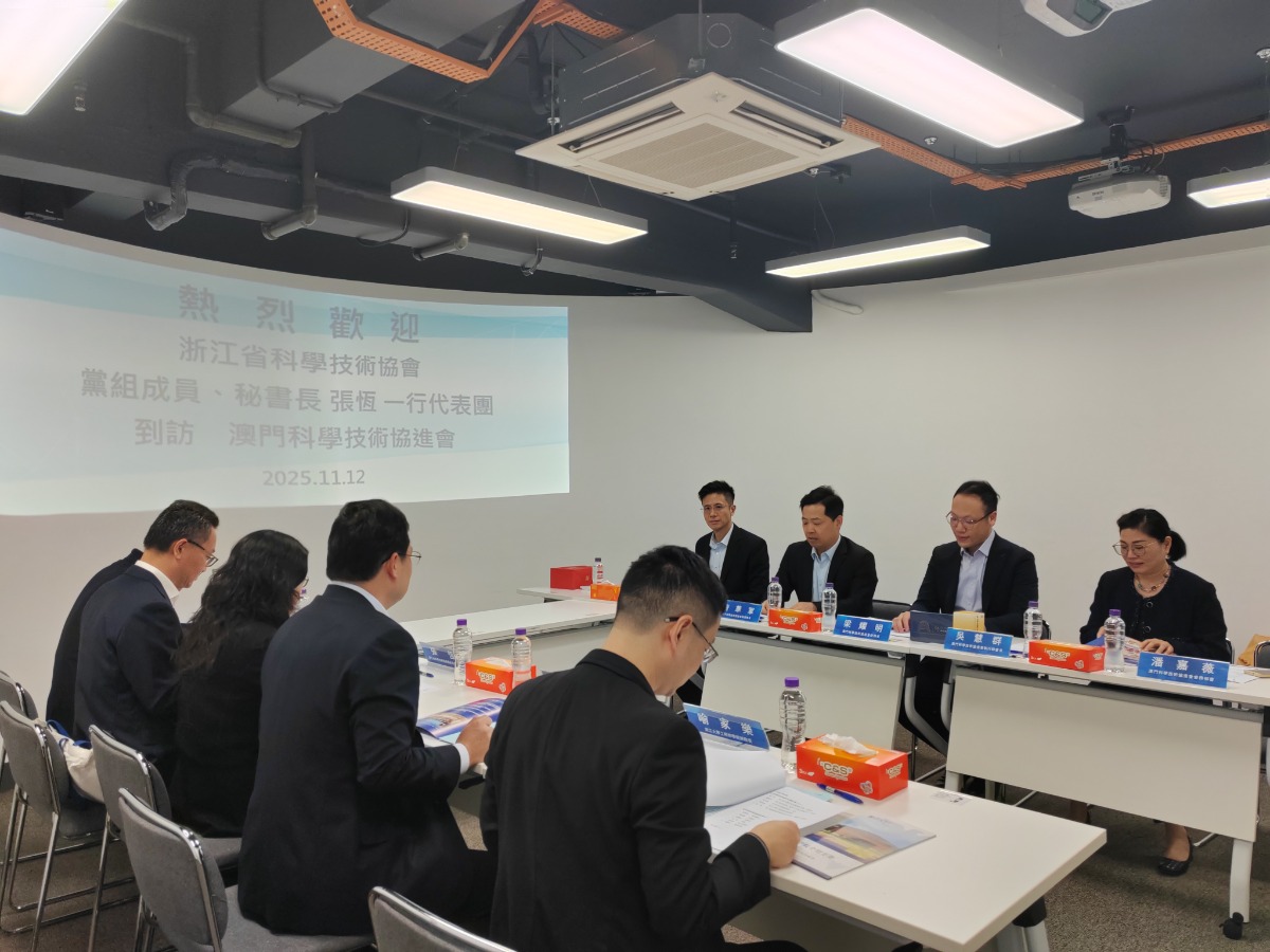 2025年11月12日下午,浙江省科學技術協會黨組成員、秘書長張恆率領代表團一行5人到訪澳門科協,獲本會副理事長唐華軍、秘書長陳敬濂等負責人熱情接待。雙方就兩地科學技術合作、科技人才交流互動、服務地方科技經濟融合發展等內容展開交流座談,並就未來加強兩地學術交流、促進產學研領域合作、深化科普工作、密切開展兩地人才互訪等可行性進行探討。