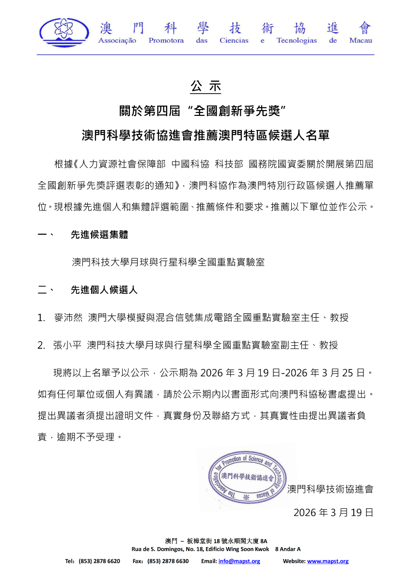 關於第四屆“全國創新爭先獎”澳門科學技術協進會推薦澳門特區候選人名單